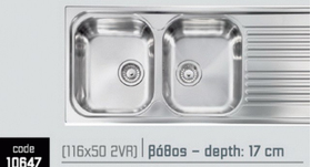 Περιγραφή: Γυαλισμένος διπλός νεροχύτης. Εντοιχίζεται σε ερμάριο 80εκ. Βάθος γούρνας: 16cm